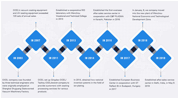 Founded in 2003, CICEL is a mechanical engineering technology supplier dedicated to the R&D and manufacturing of PVD vacuum coating equipment and UV coating ecuipment, providing customers with comprehensive and reasonable coating solutions. For a long time, ClCEL. has provided highly reliable vacuum coating technology solutions to customers in more than 50 countries around the world with its excellent product innovation capabilities and complete after-sales service system.