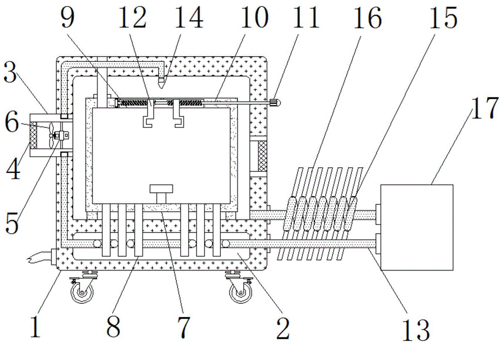 排水管15貫穿于鍍膜機外壁1,且排水管15呈螺旋結(jié)構(gòu),可以使排水管15中的熱水在散熱鰭16中流經(jīng)的時間更長,使得排水管15中的熱水可以進行初步的降溫冷卻。